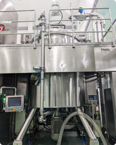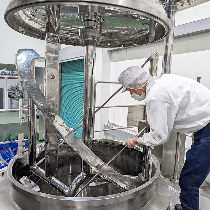 スパイラルブレード(らせん状のブレード型攪拌装置)を採用した真空乳化装置、溶解槽を設置。