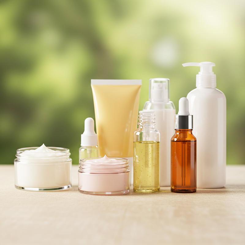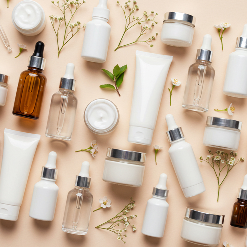 中身(バルク)は、化粧水や乳液などのスキンケア系から、ファンデーションやヘアケア商品、メイク系まで多岐に渡ります。また、容器の大きさや形状も様々。